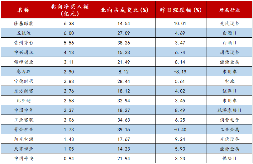 昨天的大涨和北向强势回流关系密切因,日内狂怼了135亿元,创近五个月新高。北向强势回归,除了对市场的情绪提振作用,对市场风格也有着直接的影响。下图是北向昨天净买入的TOP15,可以看出相关标的所代表的行业昨天表现都不错,尤其是新能源。