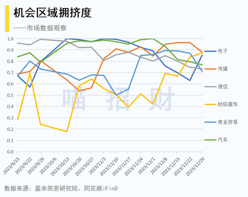 从行业拥挤度层面看,交易活跃度起来的方向是电子,这里面消费电子的逻辑比较顺。今年消费电子大背景是复苏的,中期有CES和苹果MR设备的预期在,在这里面的资金估计会持续活跃,我们对这块聊得也比较多了,可以继续跟着走。