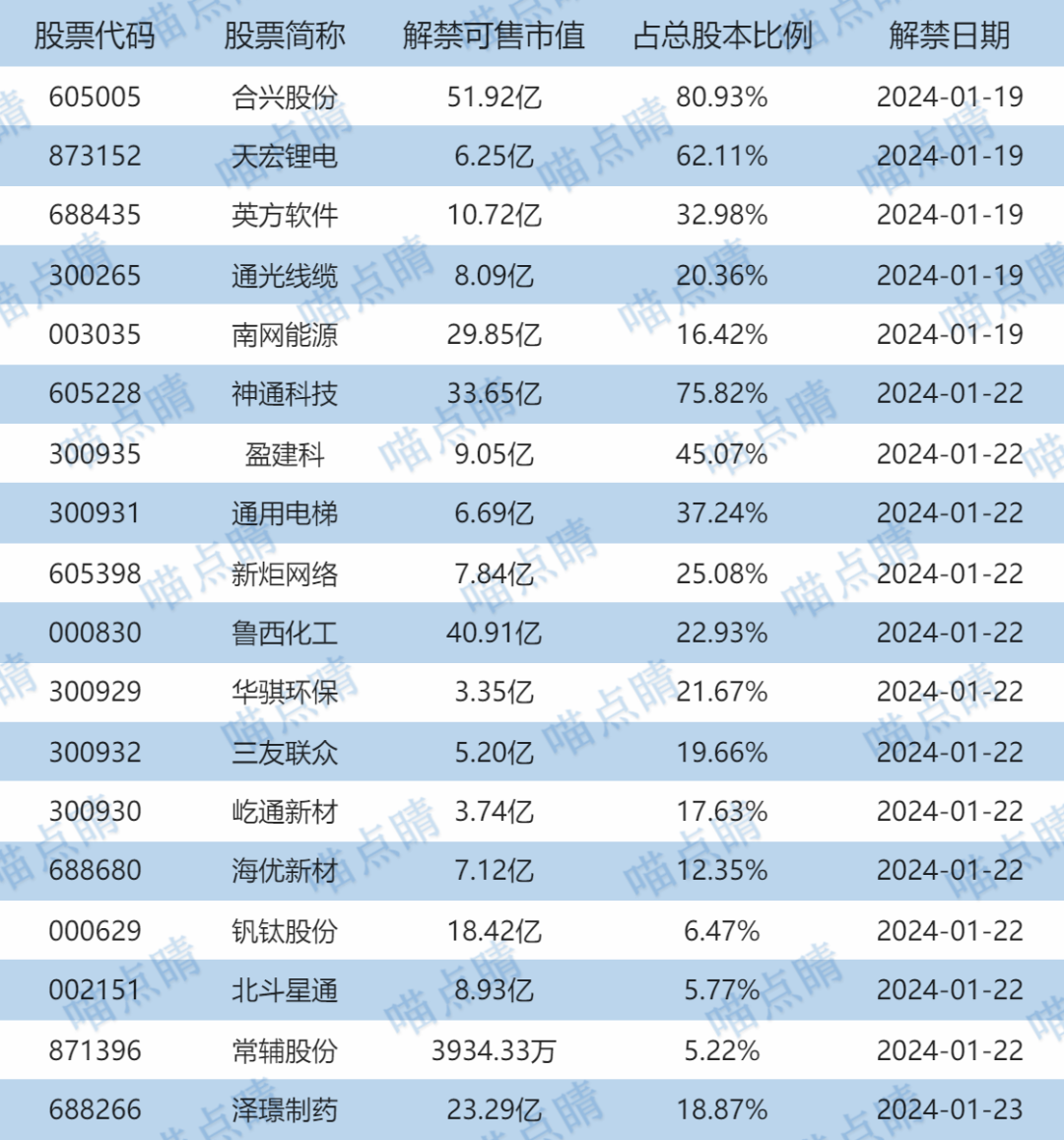 今天合兴股份、天宏锂电等有大额可售解禁。