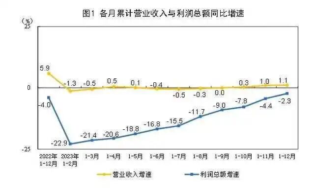 3,2023年全国规模以上工业企业实现利润总额76858亿元,同比-2.3%,降幅比1至11月份收窄2.1个百分点。如下图所示,降幅逐步收窄的趋势很明显。单看12月份,规模以上工业企业实现利润同比+16.8%。营收方面,2023年累计同比+1.1%,也实现了连续6个月回升。