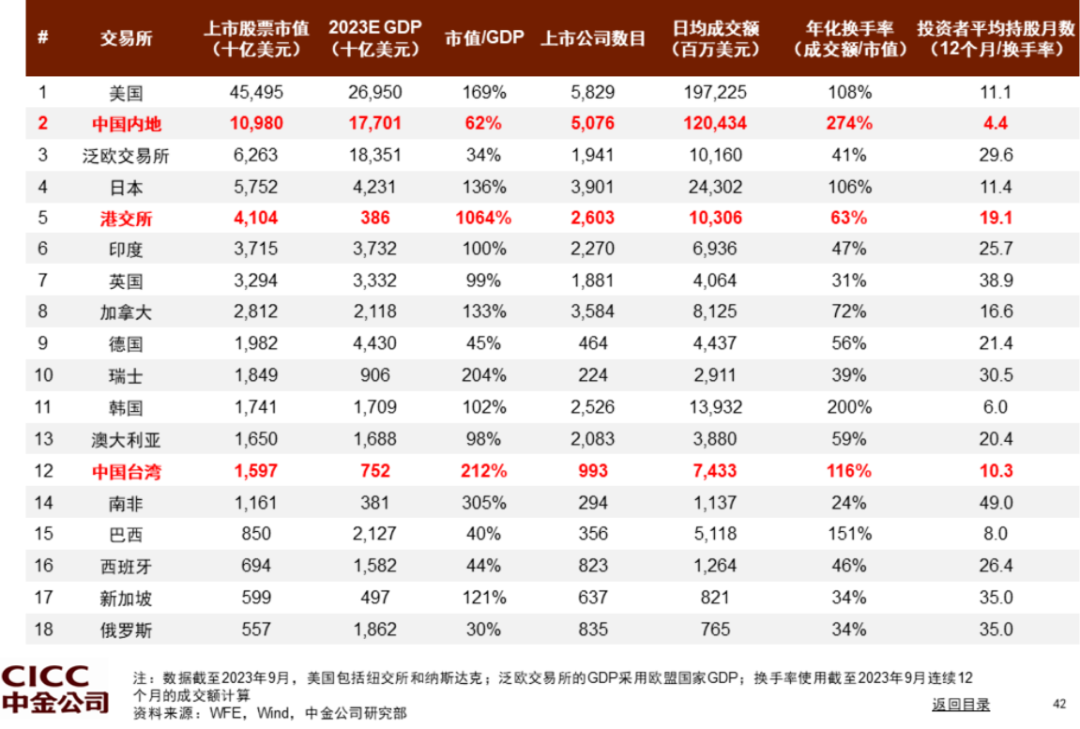 从下图可以看出,A股的市值占比GDP在全球主流市场中算是比较小的,而且这数据是截止去年9月,考虑到近半年市值的蒸发,如今的数据无疑会更低。市值占比低,但5000多家的上市公司数量却几乎持平四倍于A股市值的美股,这些数据背后反应出A股龙头公司规模效应的欠缺。