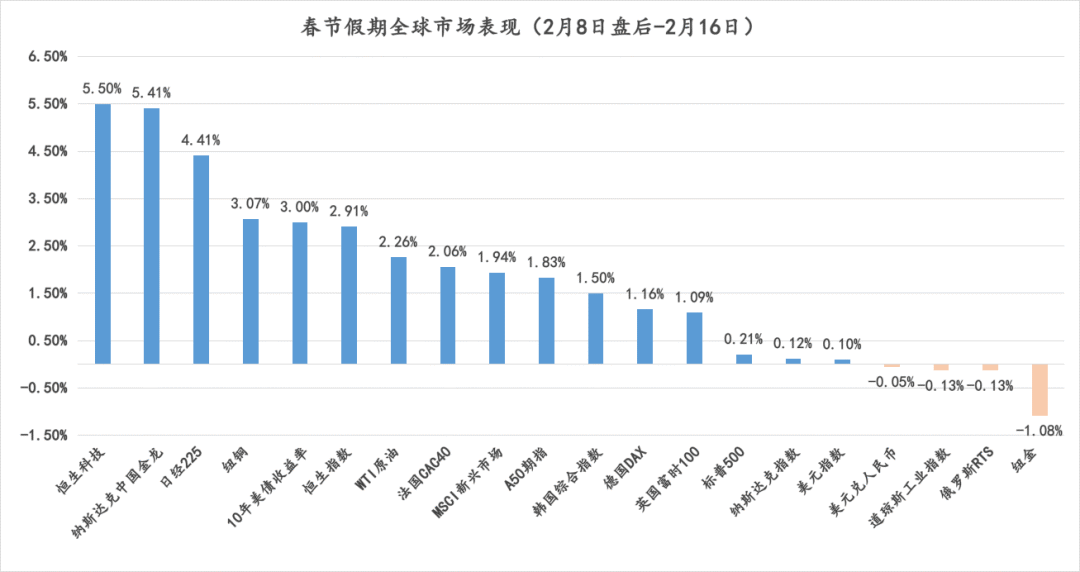 1、首先就是假期内外围市场的表现,以恒科和金龙为代表的中概资产颇为亮眼,港股实现三连阳,领涨全球。