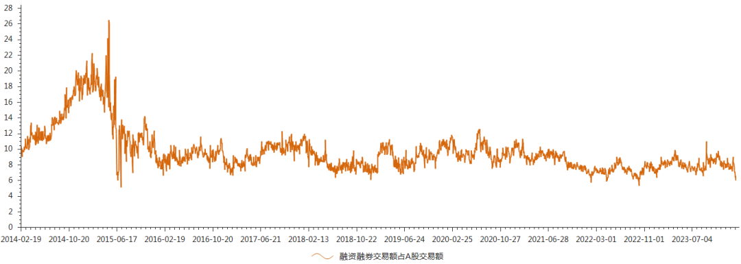 在融资盘大幅降低后,两融成交额占A股成交额比值也来到了近10年低位,近期一度逼近6%以下,是近十年的第六低。因此能看出,两融的压力已经大幅减小。
