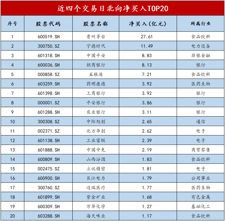 这种真金白银的变化,意味着外资可能回来了,我比较好奇,没有大力哥参与的那四天,外资都买了啥,下图是我整理的北向近四个交易日净买入Top20。