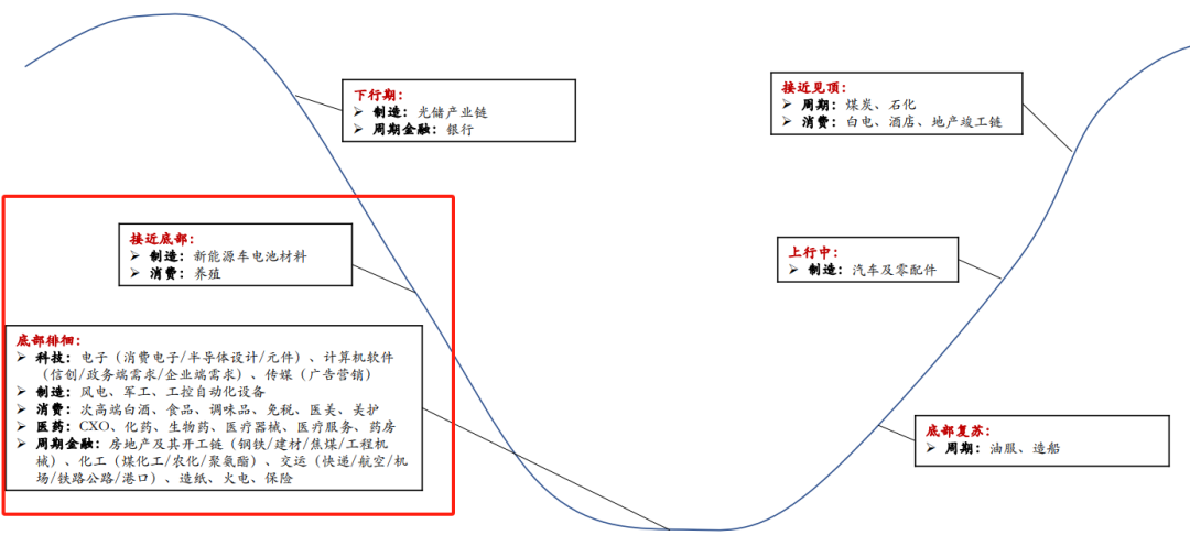 只要市场情绪恢复,流动性充足,就会发现现在趴在地上的落难公主还有很多,都有轮动机会。贴一个我上周看到的图,大致展示了一下全行业目前的产业周期位置,大家自行体会一下吧。P.S:红框里的方向点睛组合覆盖了一大半
