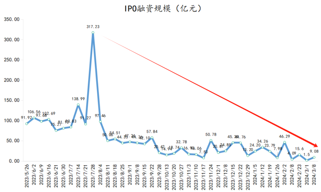 再给大家看两张图。先是IPO融资的趋势变化,从去年7月”活跃资本市场”开始,融资额一路向下,虽然现在每周还有零星的发行,但从图上看基本都是匍匐前行。在严控质量的背景下,该趋势未来也大概率会延续。