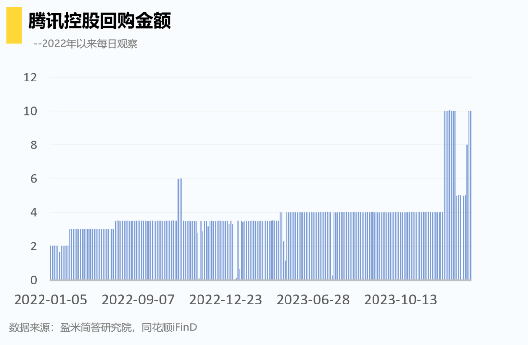 从2022年开始,腾讯的回购金额先提升到了单日2亿,随后3亿,到2023年下半年已经稳定在了4亿。今年上半年波动比较大的时候,甚至持续了一段时间单日10亿的状态。