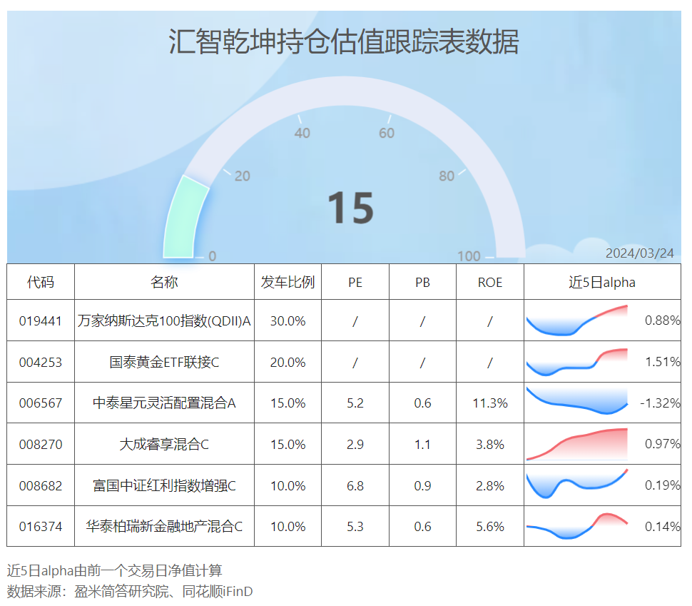 1、汇智乾坤上周发车不变,配置如上图所示。组合一直是高权益仓位运行的,因为策略设计,没法大开大合的调整仓位,目前权益底仓有近7成在成长板块,因此组合相对来说弹性比较大。常读文章的小伙伴知道,我们很早就开始聊国企改革,聊对高股息的理解,其实组合也在不断加仓红利资产,当前每周定投以红利、qdii、黄金为主。