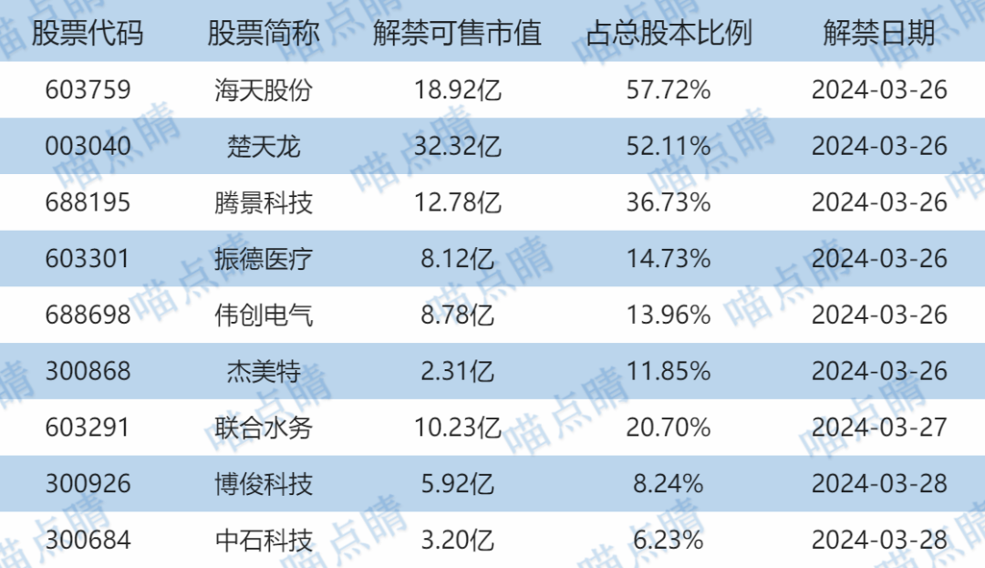 今天海天股份、楚天龙等有大额可售解禁。