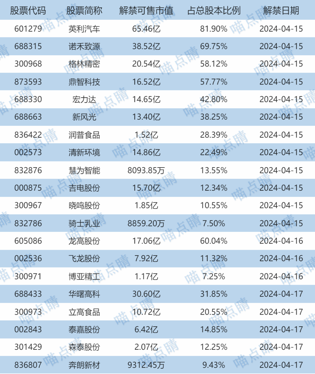 今天英利汽车、诺禾致源等有大额可售解禁。