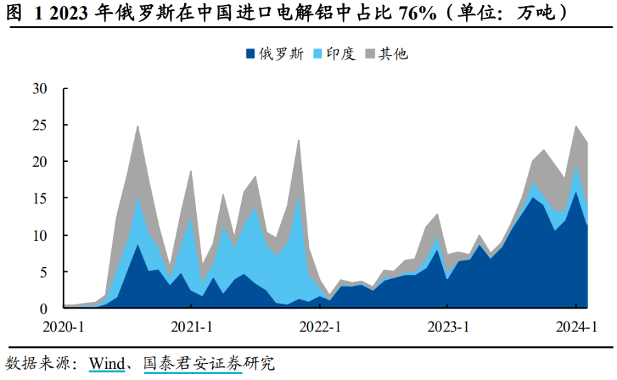 这里有一部分的量流入了中国,可以看到2022年开始,俄罗斯在中国进口电解铝中的占比在持续提升。