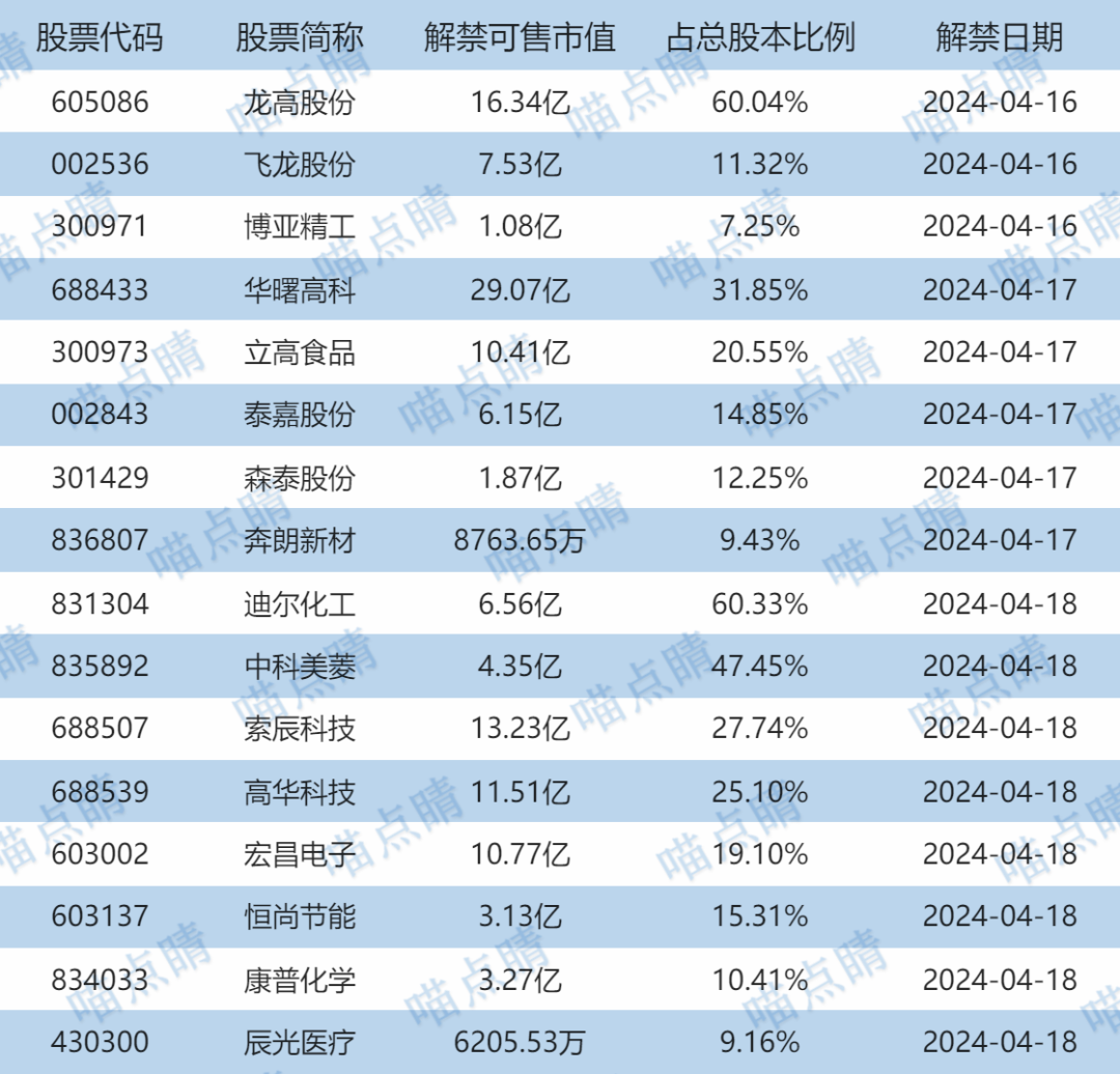 今天龙高股份、飞龙股份等有大额可售解禁。