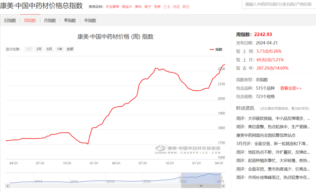涨价是中药材2023年的关键词。中药材价格在2023年坐了一轮过山车。天地中药材综合200指数、康美中药材价格总指数均在2023年8月前后创下历史新高,中药材正在经历“几十年一遇”的涨价潮。