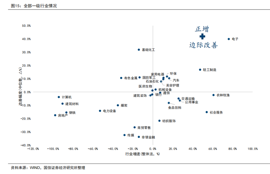 纵轴是行业内个股的改善幅度中位数,横轴是整个行业的增速。从这个角度上看,电子和轻工制造是这一次财报里业绩改善最强的一级行业,无论是公司还是整个行业都有非常明显的改善。