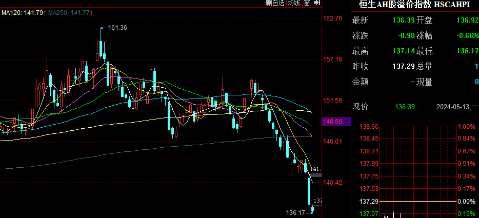 由于中字头权重大,这波直接把AH溢价干到了136,非常夸张。。最近看一个研究测算,如果剔除红利税的影响,理论上AH溢价可以到138,然而现在已经突破了。。