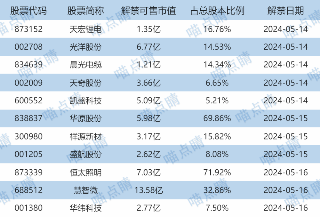 今天天宏锂电、光洋股份等有大额可售解禁。