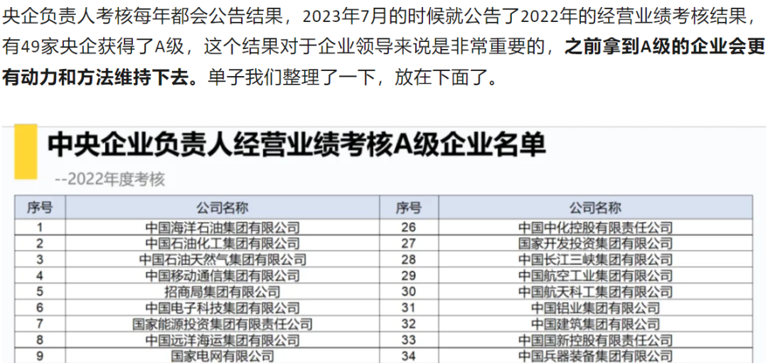 3个月前咱跟大伙儿聊过一个央企经营考核的A级企业名单,总共有49家公司(文末有直达链接跳转原文)。能够被评为A级的经营能力上肯定是相对好的,并且都有继续维持在A级的动力,优等生答案其实官方都给出来了。