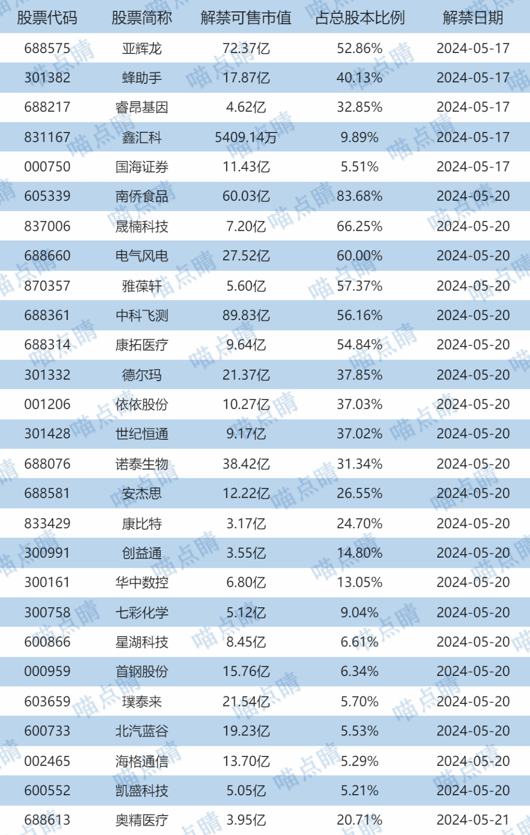 今天亚辉龙、蜂助手等有大额可售解禁。