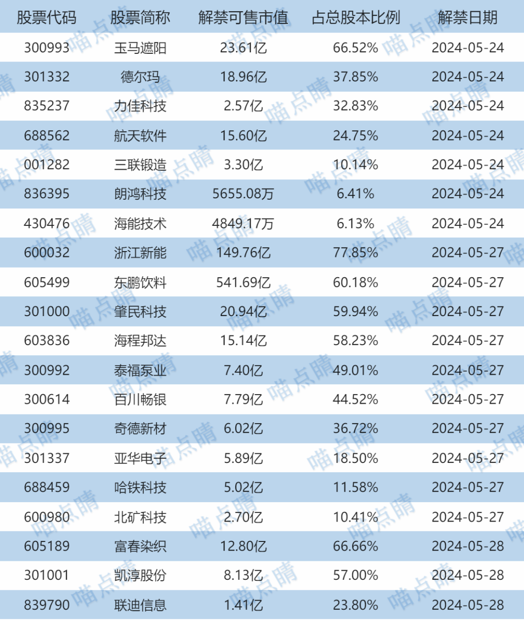 今天玉马遮阳、德尔玛等有大额可售解禁。