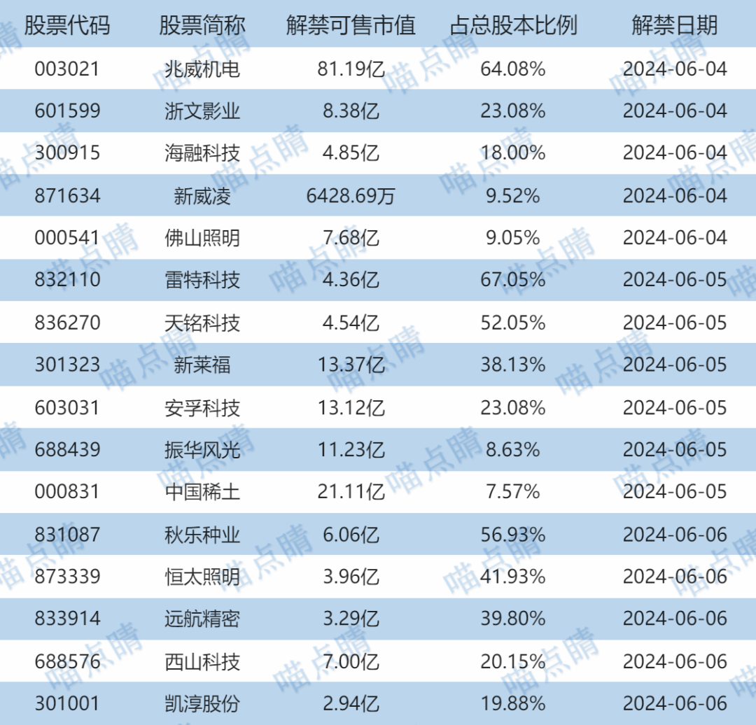 今天兆威机电、浙文影业等有大额可售解禁。