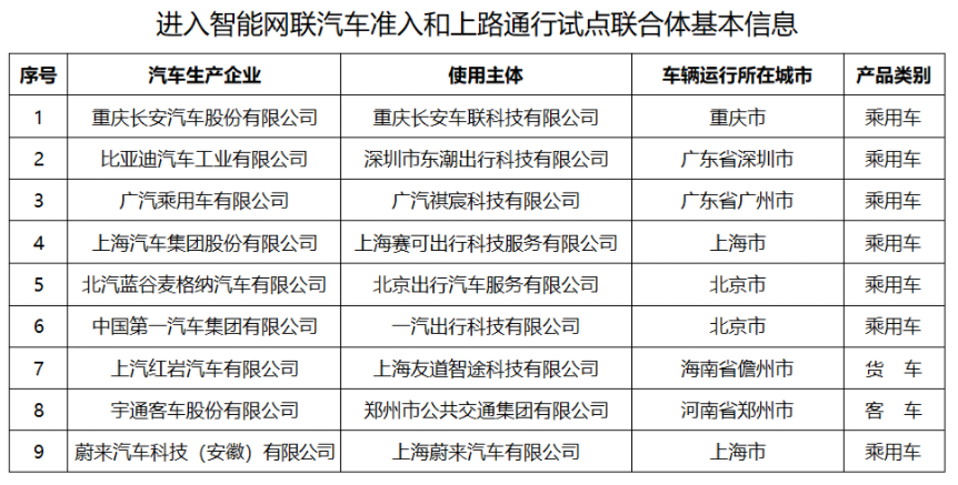 1、四部门有序开展智能网联汽车准入和上路通行试点,整个过程分为五个阶段,分别是试点申报、产品准入试点、上路通行试点、试点暂停与退出、评估调整,这次完成了第一阶段的遴选,有9家车企进入试点。