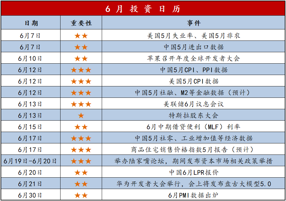 包括影响美联储降息相关的价格、就业等数据(或直接决定年内降息次数),以及验证国内基本面的众多经济数据(复苏阶段性证伪还是证实),还有会在科技领域掀起风浪的苹果和华为全球开发者大会等等。