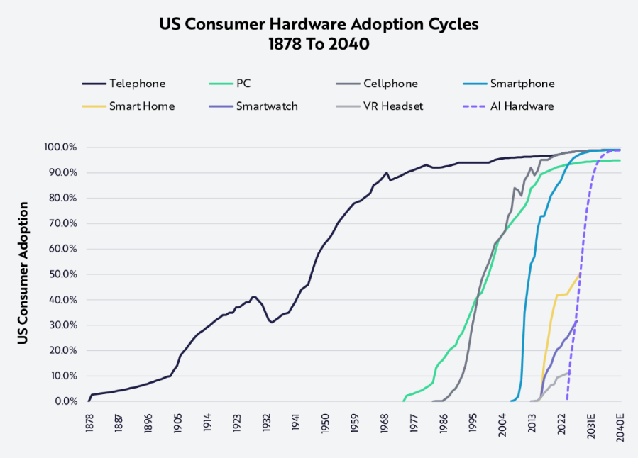 ARK预测,AI硬件的提升速度会更快,可以在不到四年的时间里渗透到美国互联网用户群的50%,到2030年底渗透率接近75%。驱动这一渗透率提升的动能,就是人机交互的新模式。