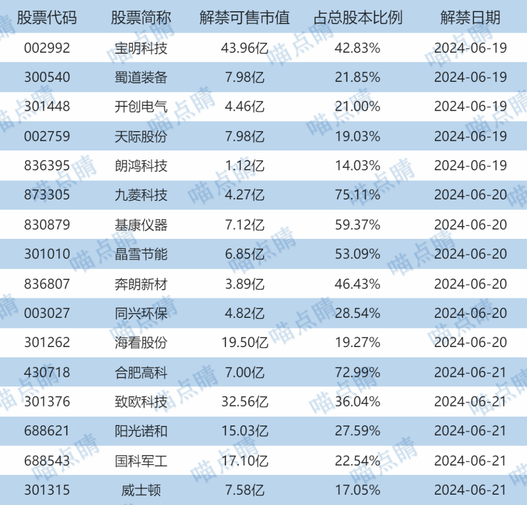 今天宝明科技、蜀道装备等有大额可售解禁。