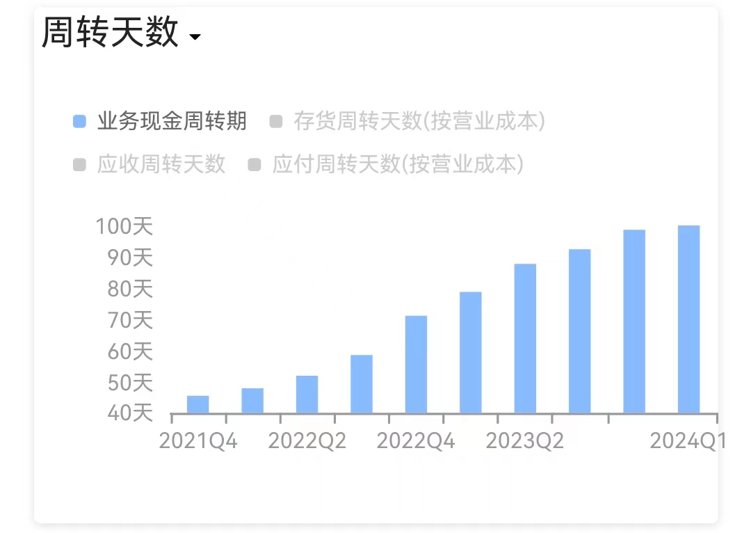 公司对于投资者关注的经营现金净流量这个指标,一直是不错的正值,反映经营净收现。这里有一个冲突点,是上市公司公司现金周转天数也在持续增加,说明公司现金流的回流压力是在持续增大的,叠加高有息负债的状态,这里确实是挑战。