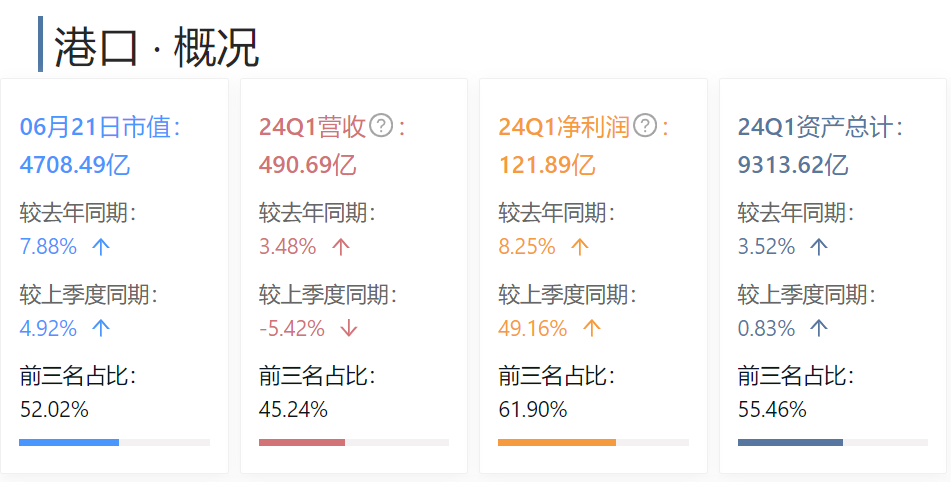 港口是一个一超多强的板块,超就是上港集团,市值最大,二强就是宁波港青岛港,排在老四的招商港口还没有迈过500亿市值,第三梯队就是150亿-300亿之间的那些公司。前三名占据52%的板块市值,45%的行业收入,62%的行业利润,55%的板块总资产。