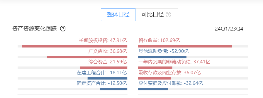 板块整体的状态是留存收益增加,即行业利润积累,流动负债减少、应付票据减少。在资产端,板块的长期股权投资增加,综合资金和应收积累增加,同时固定资产和在建工程减少。