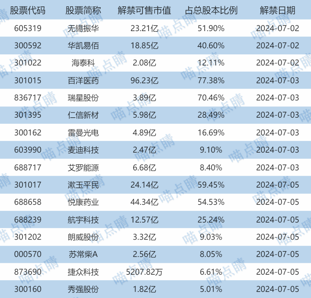 今天无锡振华、华凯易佰等有大额可售解禁。