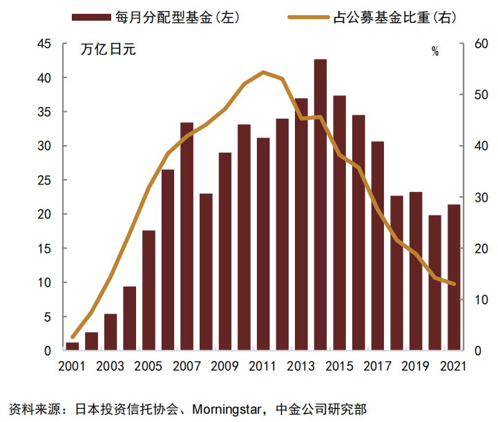 这一类的产品在日本和台湾是非常流行的,日本的第1款按月分配的红利型产品是在1997年发行的,这类产品在后面几年最高峰的时候达到了整个基金规模的50%以上,后面随着日本央行入市,加上市场整体走出低谷,定期分红类防御型基金产品的市场份额下降回落到30%。