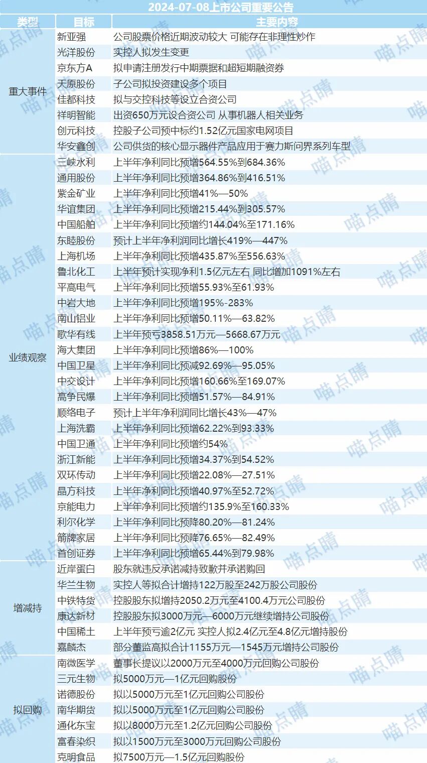 8、三峡水利上半年预盈2.08亿元至2.46亿元,同比+564.55%到684.36%。一方面去年来水量少,低基数下,今年放量明显,另一方面外购电均价下降,对业绩也有提振。话说今年南方水有些大,水电业绩应该都还行。