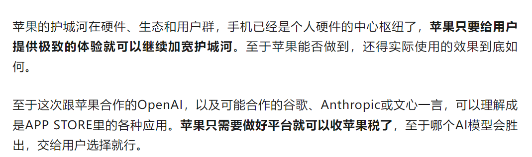 苹果最近是在持续跟大伙儿聊的,AI有可能会给苹果带来极大的变化,具有市场份额的定价权一下又显现出来了(文末有原文链接)。今年新的iphone大概率就是拉动苹果营收出现拐点的产品,但能否放量大家是有疑问的,毕竟苹果的AI在明年才能上线。