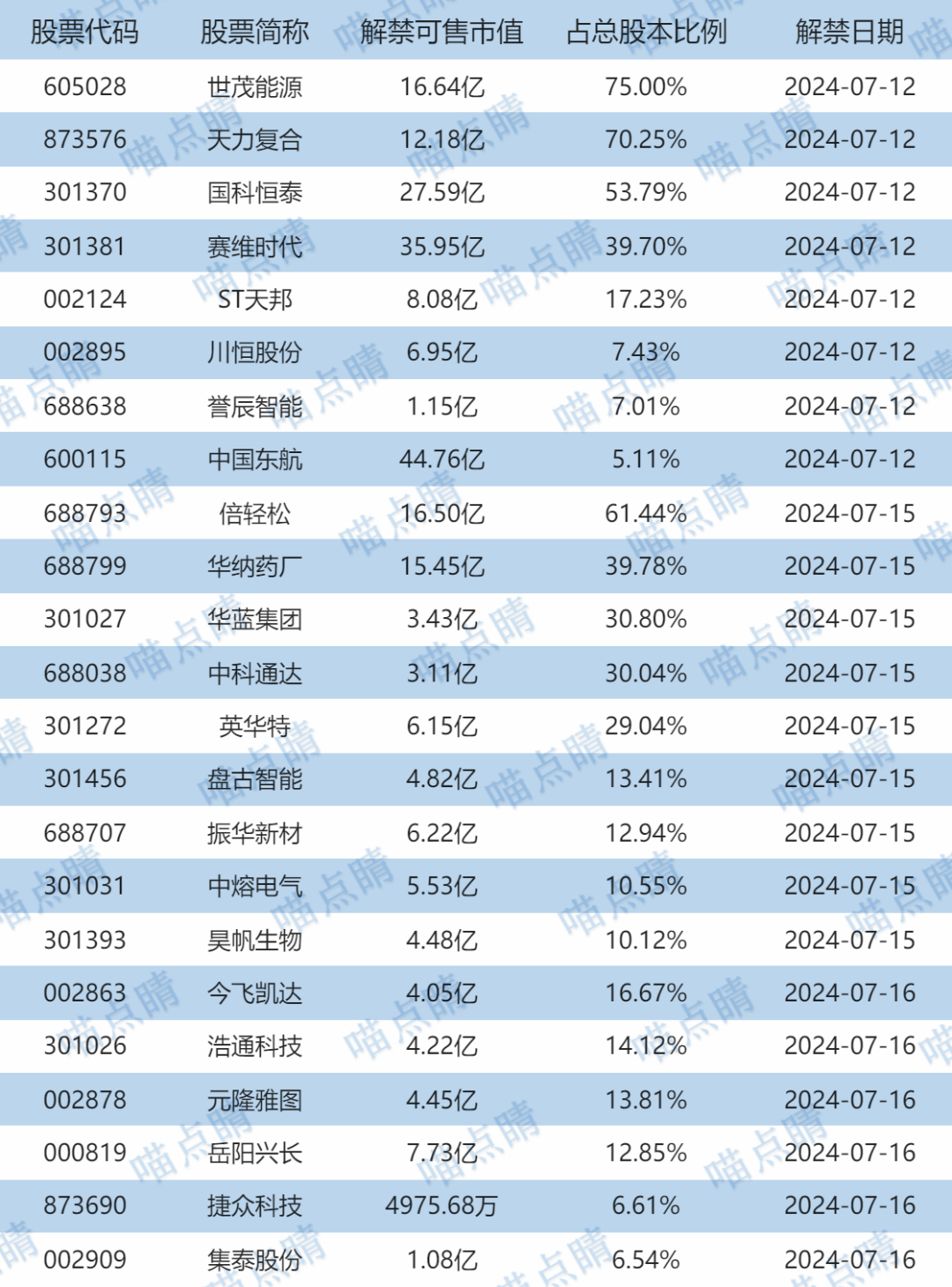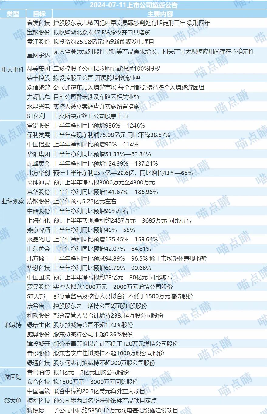 7、山东黄金上半年预盈12.50亿元至14.50亿元,同比+42.07%至64.81%。金价维持高位,利润滚滚来,与此同时,资源并购同步进一步推动公司利润上涨。不过今年股价走的也比较顶,中报下来依然有50倍的估值,下半年需要继续保持当下的增速方可进一步消化。