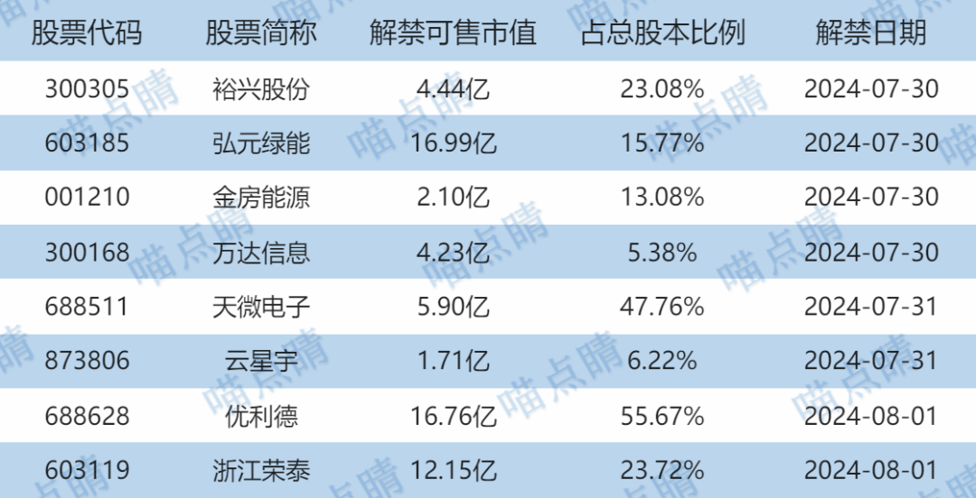 今天裕兴股份、弘元绿能等有大额可售解禁。