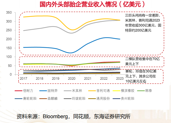 首先是行业的梯队,米其林、普利司通和固特异处于第一梯队,市占率均在9%以上;二梯队企业营收集中在70亿美元附近,市占率在2%-9%之间;我国企业基本都在第三梯队,赛轮和玲珑的营收在30亿美元,其他公司都是10亿美元左右。