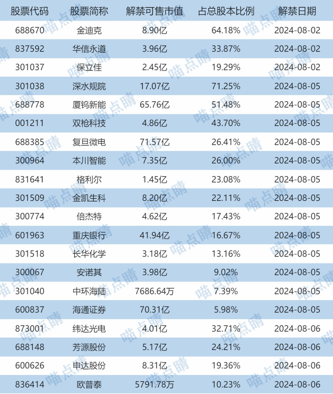 今天金迪克、华信永道等有大额可售解禁。
