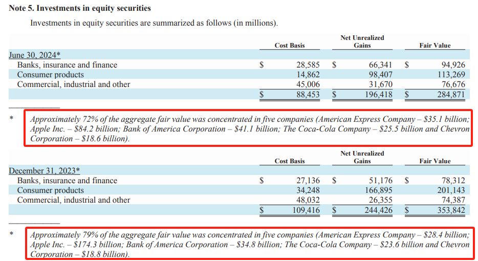 2)苹果落袋50%,前五大持仓苹果(842亿美元)、美国银行(411亿美元)、美国运通(351亿美元)、可口可乐(255亿美元)、雪佛龙(186亿美元)