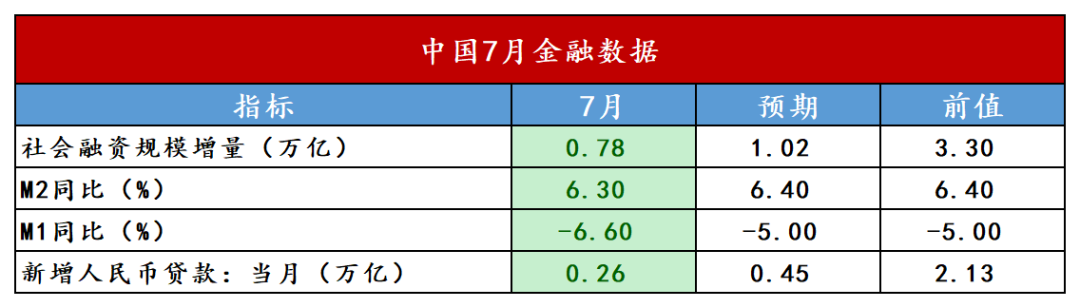 1、7月金融数据出炉,如下图所示,社融、信贷,M2和M1均低于预期。整体来看,金融数据还是有点弱,除了信贷需求偏弱的影响外,”挤水分”对数据的影响尤在,部分虚增的存贷款挤掉后,金融数据会出现一定回落。