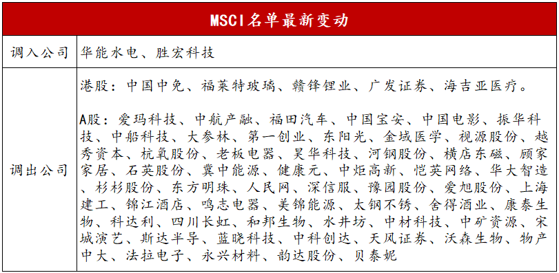 3、MSCI公布了8月指数审议结果,其中2只A股被纳入,60只中国股票则遭到剔除,具体调整如下图所示,将于8月30日生效。根据指数调整的历史经验,指数类产品通常会选在最后一天调仓,因此权重较大的个股,尾盘会有异常波动,还是值得关注下。