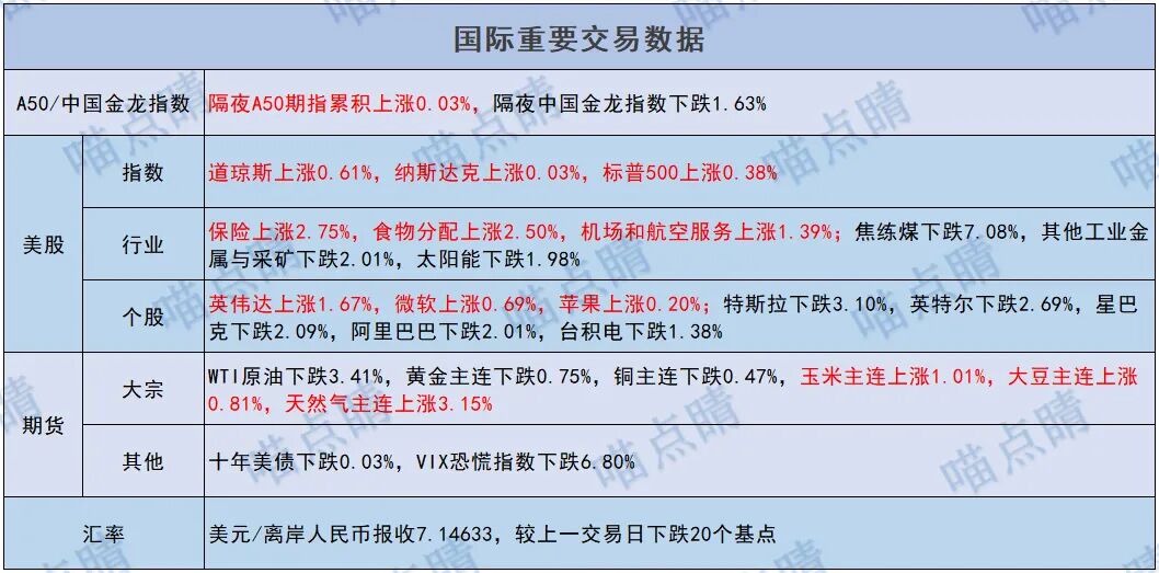 该说不说,这结果挺艺术的,既强化了降息预期,同时也没触到衰退的霉头。不过可能也是由于数据意义不太明确,昨晚美股反馈不大,三大指数小幅上涨,隔夜A50小涨,而金龙指数还跌了不少。