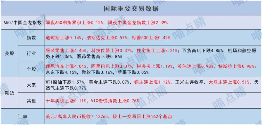 对了,伴随着昨晚一系列消息交织出炉,美股三大指数折折腾腾,最终小幅上涨,A50小涨0.12%,金龙指数上涨2.4%,近乎收复前一日跌幅。