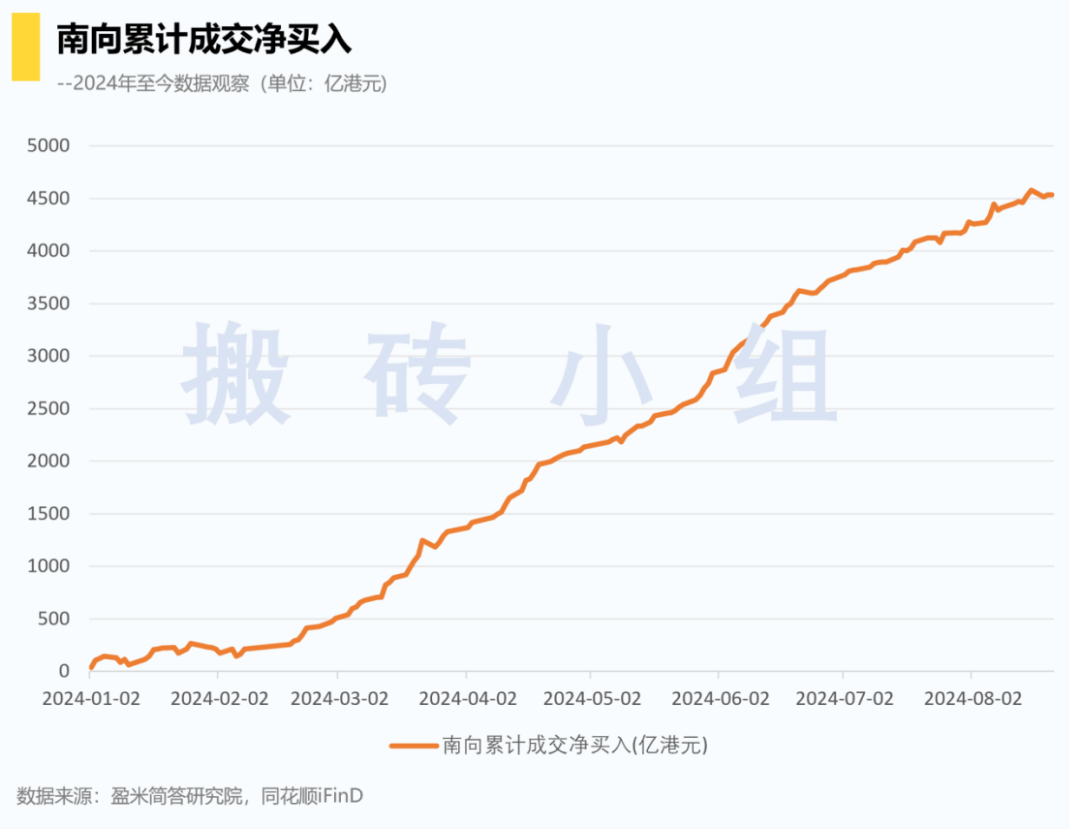 今年年初到现在,资金南下是非常强的趋势。我们拉了南下累计成交净买入的数据,这图几乎完全没有回调,资金南下的决心非常坚定。