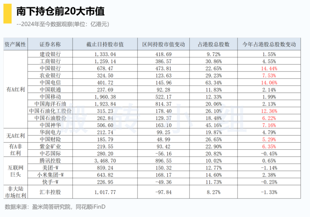 首先讲有数据的吧。我们拉了南下持仓前20大市值的公司,计算了今年以来南下持股市值和股比的变动,并且按照资产属性进行了分类,发现一些有意思的点。