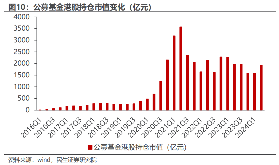 在南下资金的各种群体里,我们最容易观测的就是公募基金的变动了,二季报数据显示公募南持仓港股的市值同比有22%的增长,相对来说是不小的。