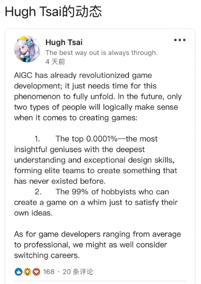 之前蔡浩宇就发过一条动态,引起了游戏圈的热烈讨论,大意是说未来游戏的开发趋势是极少数百万分之一的天才组团,创造前所未有的新东西新体验,剩余的玩家作为兴趣爱好生产普通游戏来满足自己的想法,他甚至劝一些从业者转行。