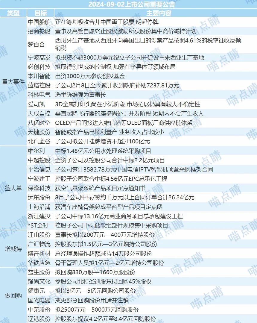 3、中国船舶拟吸收合并中国重工股票,停牌不超10个交易日。这是”南北船”两大集团实现合并五年后,中国船舶集团的又一次资产整合,迈出了解决同业竞争的关键一步。整合后,两家千亿级的上市公司有望实现”1+1>2″效应,成为世界一流船舶集团。