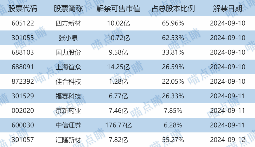 今天四方新材、张小泉等有大额可售解禁。
